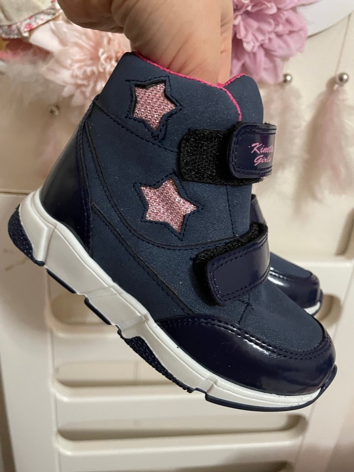 Lacivert kauçuk bot, yıldız desenli ve Velcro bantlı, trend sokak stili için uygun. Rahat ve kolay giyilir.