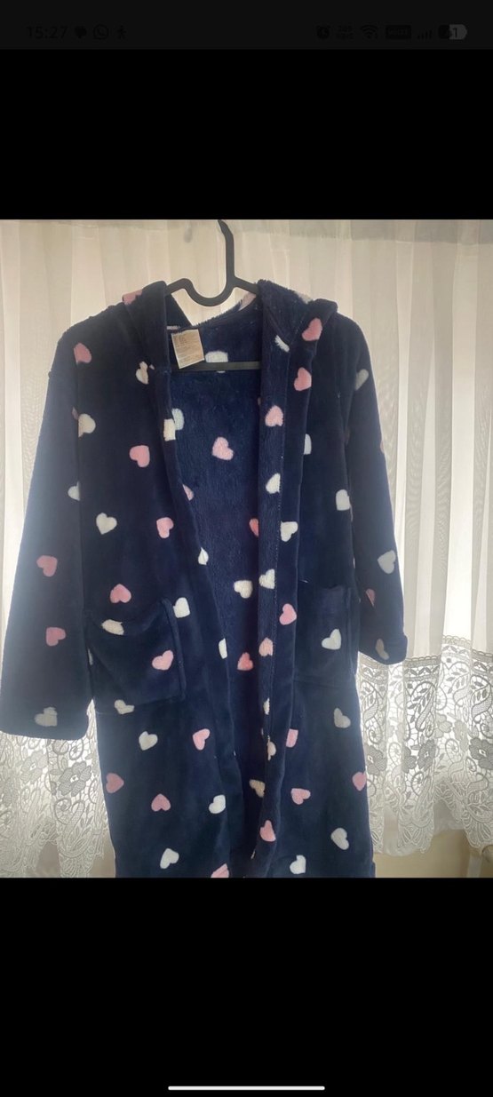 Kız çocukları için yumuşak ve sıcak kumaştan, lacivert zemin üzerine pembe ve beyaz kalp desenli kapüşonlu ve cepli bornoz.