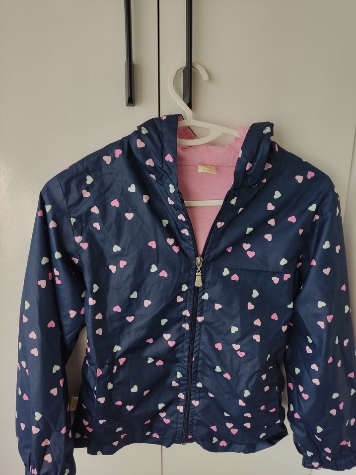 Fermuarlı ve yakalı, fitted kesim kız çocuk yağmurluğu. Yumuşak fleece kumaştan, lacivert zemin üzerine pembe ve beyaz kalp desenlidir. Trend sokak stili için uygun. ️