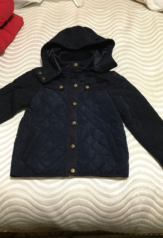 Lacivert renkli, kapüşonlu ve düğmeli kız çocuk montu. Yumuşak ve sıcak kumaştan, notched lapel yakalı, fit kesim, streetwear tarzında.