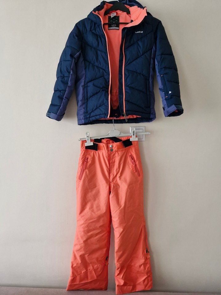 Kemerli, yakalı ve yumuşak dokulu lacivert mont ile turuncu pantolon takımı. decathlon kar takım 8.10 yasa uygun 1 kis kullanildi pantolon boyu ayarlanabiliyor