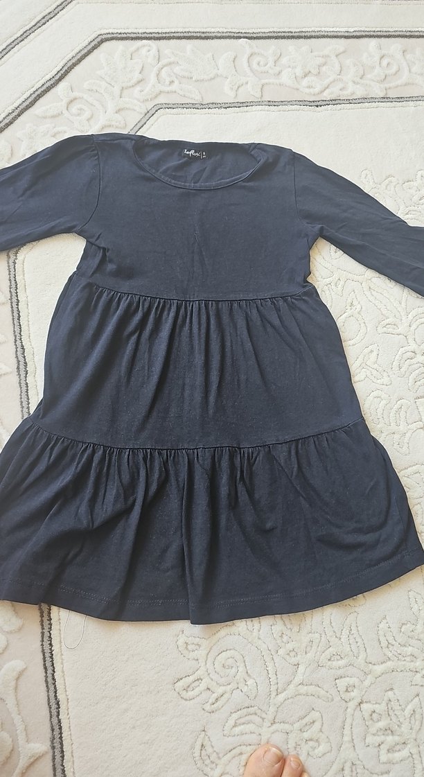 Lacivert keten kumaştan yapılmış, uzun kollu ve yuvarlak yakalı kız çocuk elbisesi. Salaş kesimi ve fırfır detaylarıyla sade tasarım sunar.