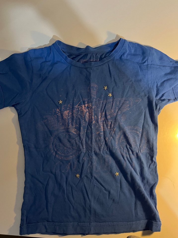 Kız çocukları için kısa kollu, bisiklet yaka, denim kumaştan yapılmış, koyu lacivert renkli ve baskılı tasarıma sahip, rahat ve şık sokak tarzı tişört.