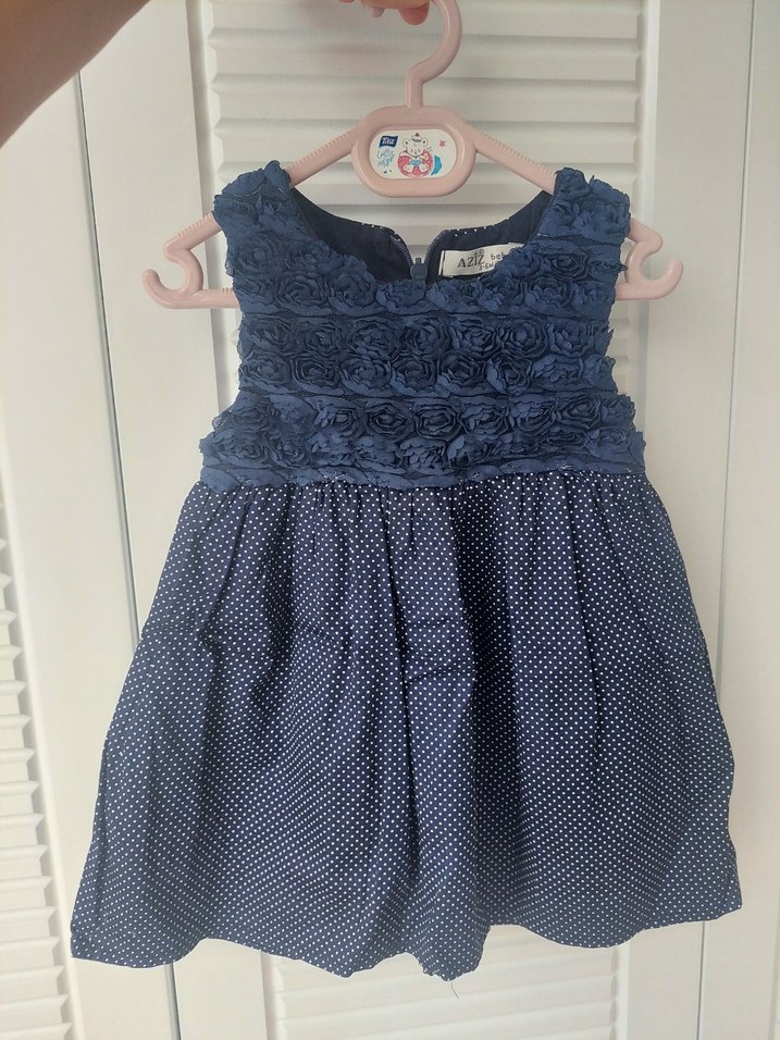 Kolsuz, straplez yakalı kız çocuk elbisesi. Üst kısmı çiçek desenli volanlı, etek kısmı koyu lacivert puantiyeli kumaştan yapılmıştır.