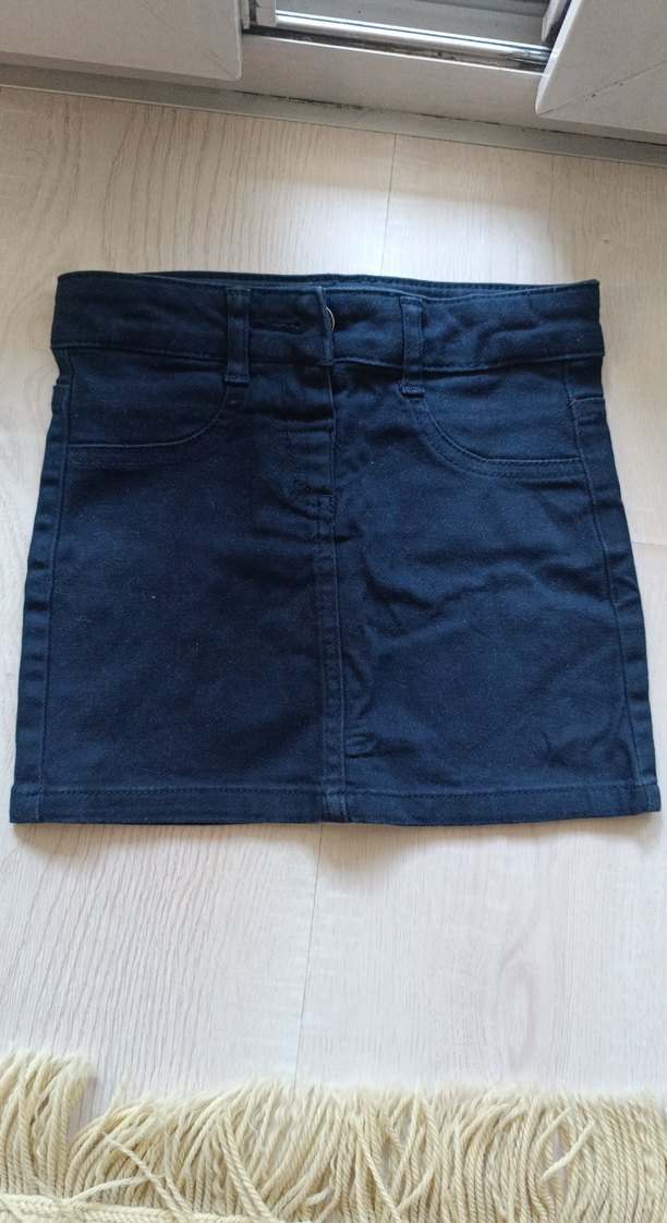 Kız çocuklar için bel kemerli, düz lacivert kot etek. Sade ve desen içermeyen, normcore tarzda, vücuda oturan kesim. 3-4 yaş.98-104 cm