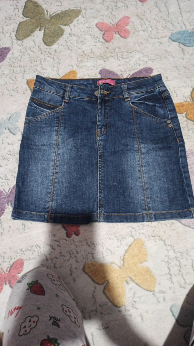 Lacivert kot kumaştan, kemerli ve dar kesim kız çocuk mini etek. Günlük kullanıma uygun, rahat sokak tarzı.