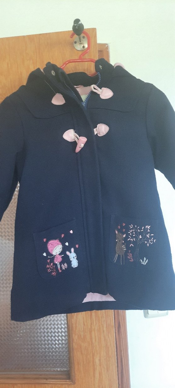 Koyu mavi, düğmeli ve yakalı, nakış detaylı, yumuşak dokulu kız çocuk kabanı. Gayet iyi durumda.Kaşe mont