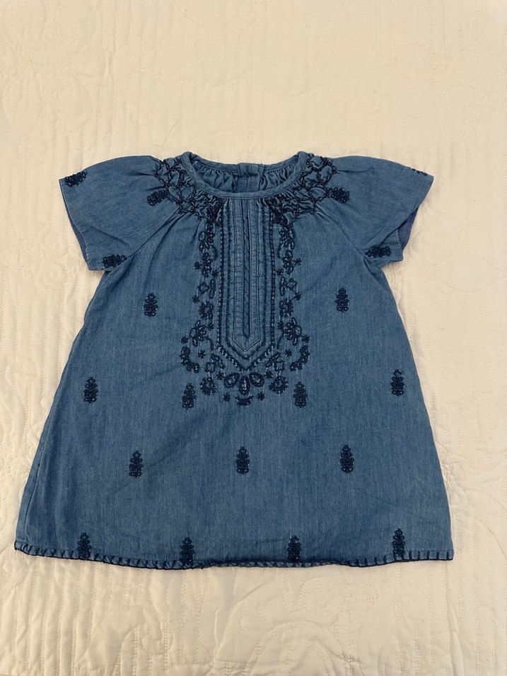 Kız çocukları için lacivert kot elbise, kısa kollu ve yuvarlak yakalıdır. Bohem tarzı nakışlı ve boncuk işleme detaylarıyla retro bir görünüm sunar.