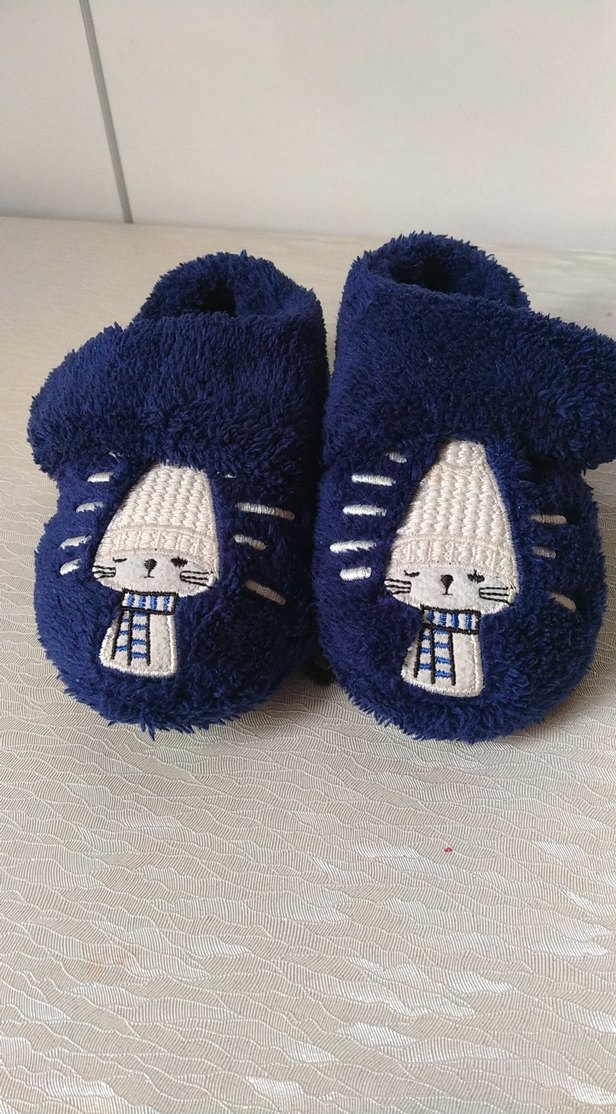 Lacivert renkli kız çocuk terlikleri, nakışlı ve örme detaylara sahiptir. Yumuşak ve sıcak kumaştan üretilmiştir, rahatlık sağlar.