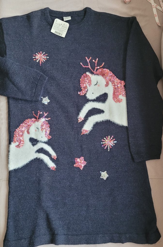 Lacivert renkli, uzun kollu, bol kesim kız çocuk triko tunik. Nakışlı unicorn ve yıldız desenleri ile süslenmiştir.