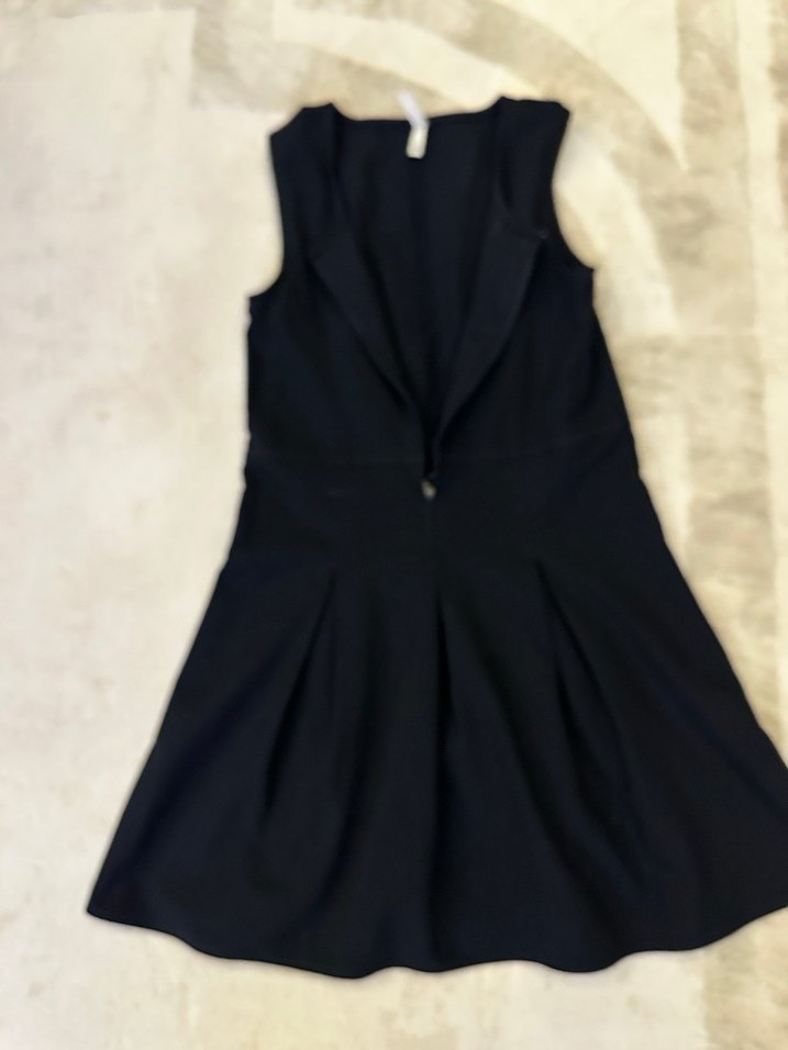 Kolsuz, lacivert elbise, vücuda oturan kesim..okul için uygun bir tercih.
