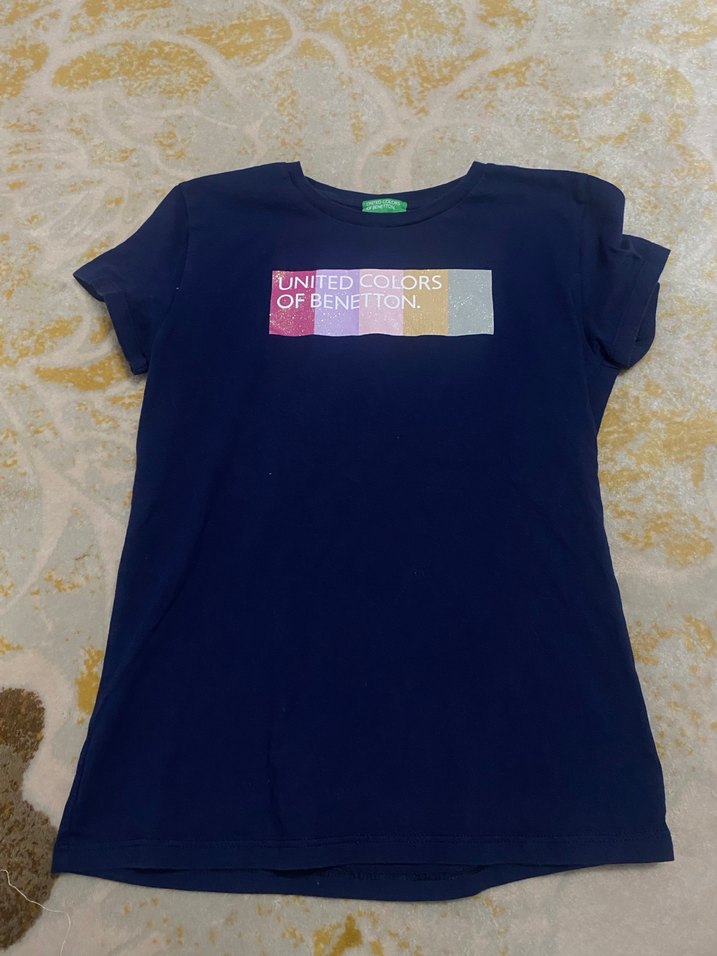 Koyu mavi, pamuklu kumaştan yapılmış, kısa kollu ve bisiklet yaka kız çocuk tişörtü. Önünde renkli 'United Colors of Benetton' logosu bulunur.