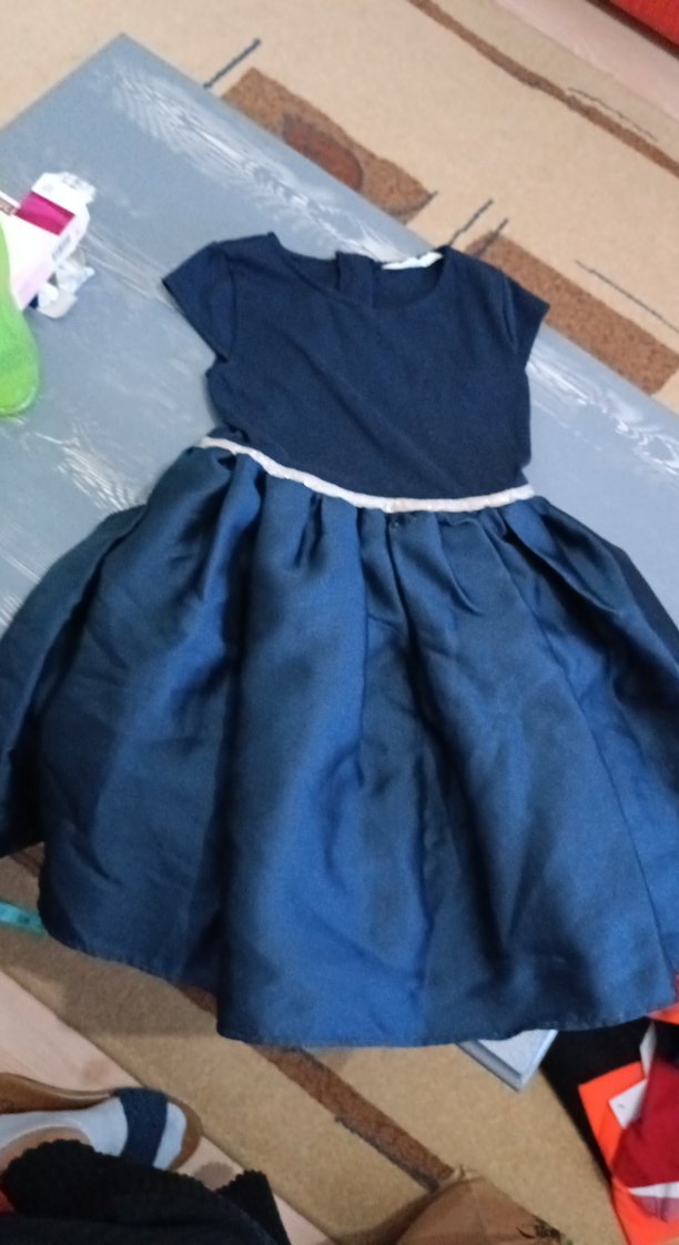 Kısa kollu, bisiklet yaka ve pilili etekli, parlak sentetik kumaştan yapılmış, klasik tarzda oturan kız çocuk elbisesi.