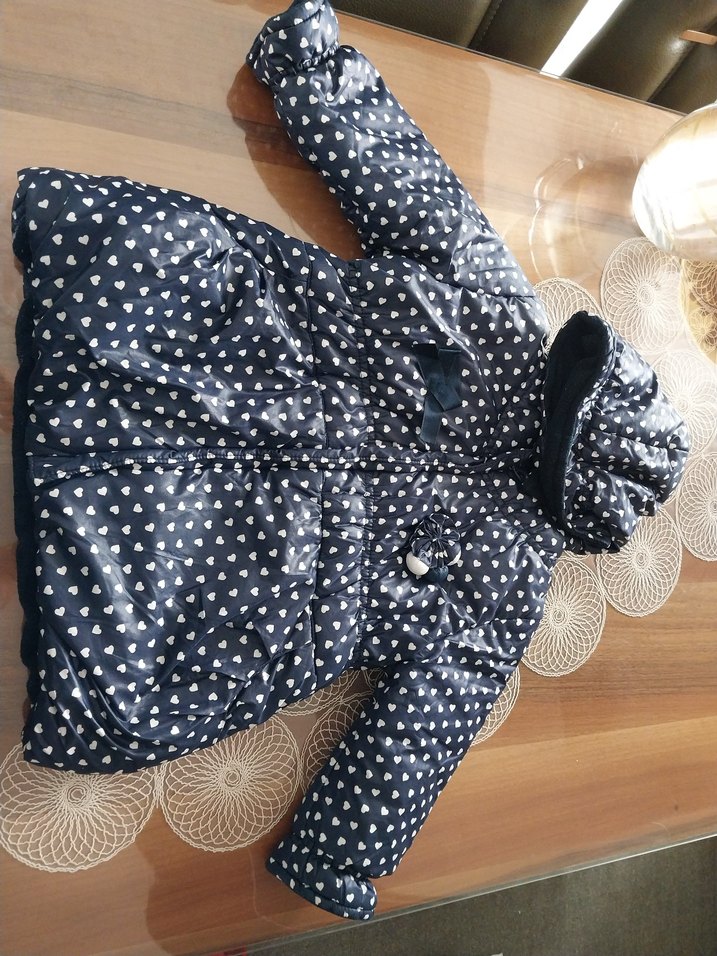 Lacivert renkli, beyaz puantiyeli, düğmeli, kesimli kız çocuk kabanı. Sentetik kumaştan, sokak stili için uygun.