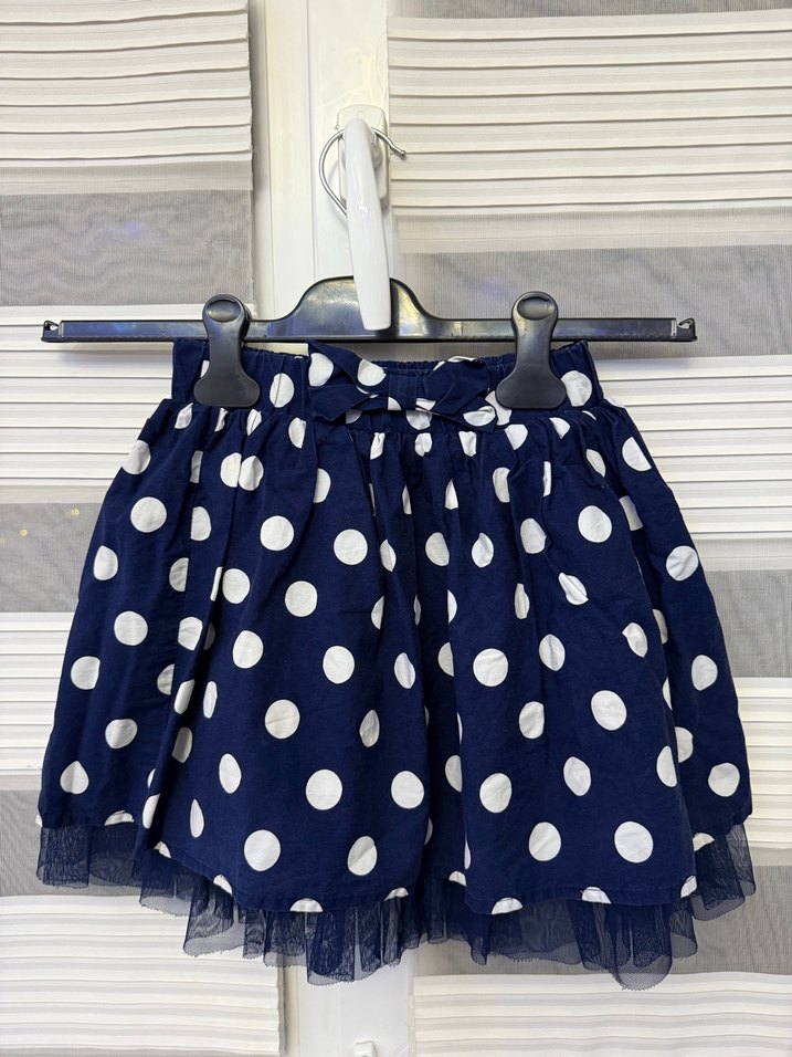 Renkli mavi ve beyaz puantiyeli, pilili ve bol kesim kız çocuk eteği. Sentetik kumaştan üretilmiş, sokak modasına uygun eğlenceli tarzda. 6-7 yaş