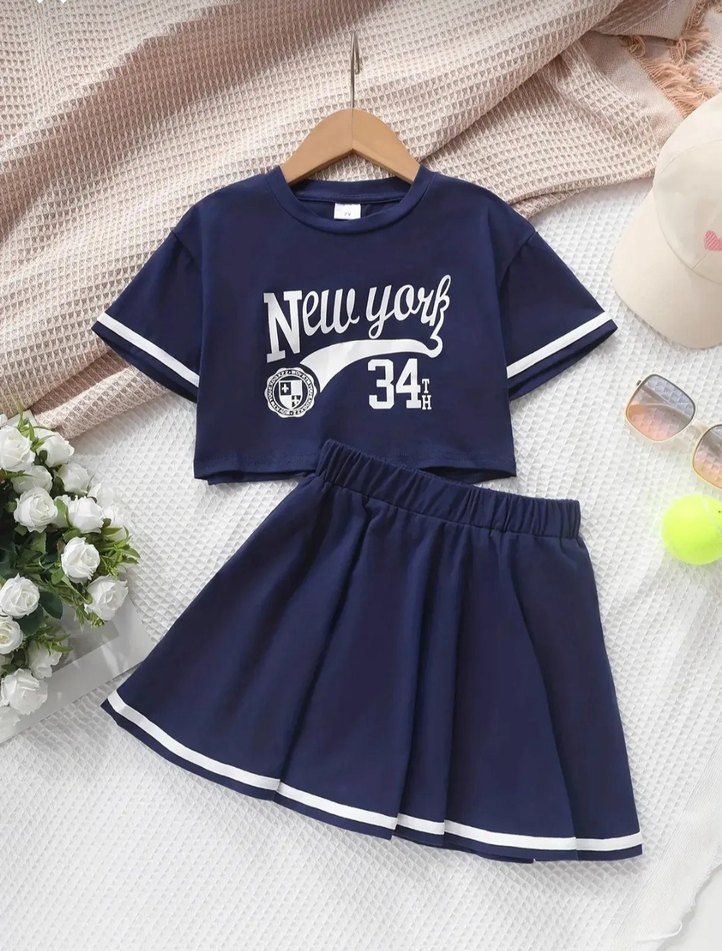 Kız çocukları için lacivert renkli, kısa kollu, yuvarlak yaka ve bol kesim rahat takım. Üzerinde 'New York 34' baskısı ve beyaz şerit detaylı etek bulunur. Sentetik, yumuşak kumaştan üretilmiştir.