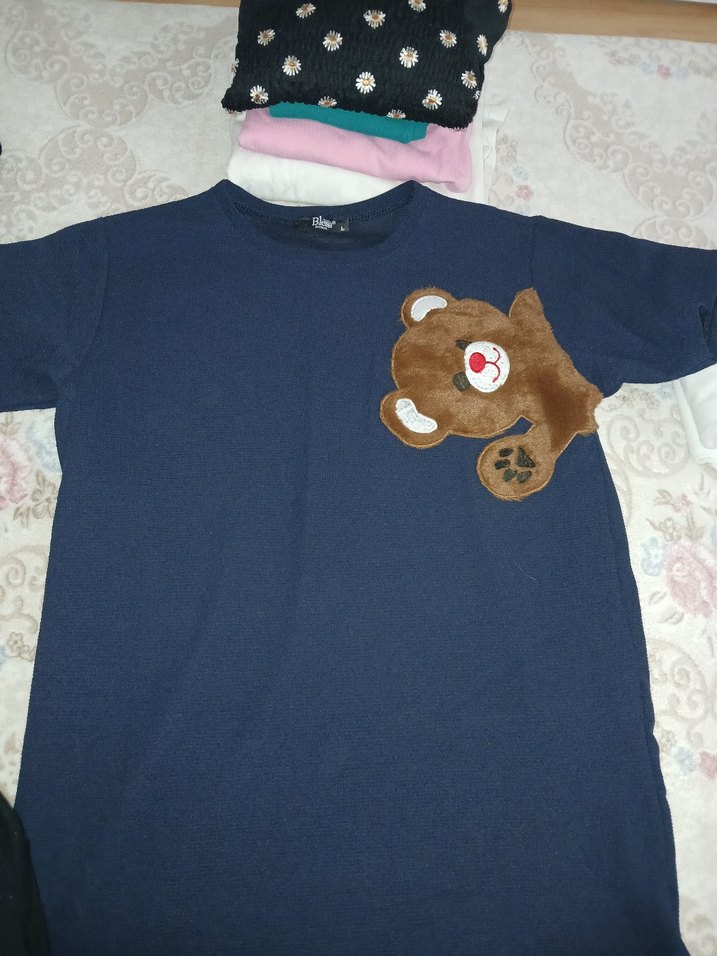 Lacivert kız çocuk tişörtü, yuvarlak yaka ve kısa kollu, bol kesim. Yumuşak ve sıcak kumaş, önünde tüylü ayıcık detayı bulunur.