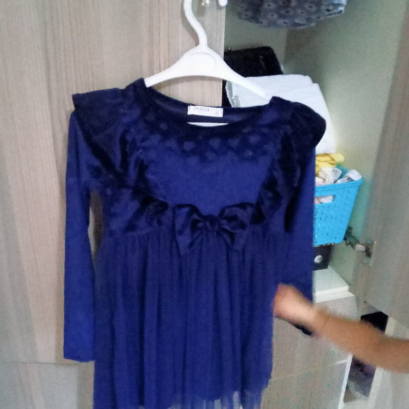 Kız çocuklar için uzun kollu, yuvarlak yakalı ve bol kesim lacivert elbise. Sentetik kumaştan yapılmış, fırfır detaylarıyla gotik tarzda, rahat bir modeldir.
