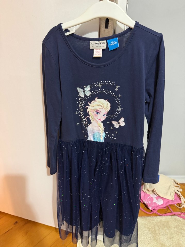 Koyu mavi renkli, uzun kollu ve simli tül etekli, baskılı karakter detaylı dar kesim kız çocuk elbisesi. Trend sokak stili için uygundur. ✨