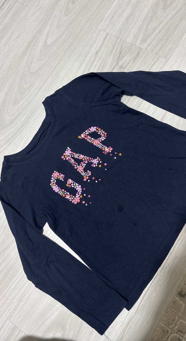 Pamuk kumaştan, lacivert renkte, uzun kollu ve bol kesim kız çocuk sweatshirt. Önünde baskılı çiçek desenli "GAP" yazısı bulunur.