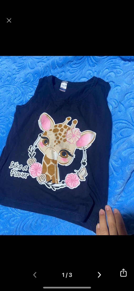 Kız çocukları için lacivert, v yaka, kolsuz ve oturan kesimde tişört. Zürafa ve çiçek baskılı, fiyonklu detaylara sahip, sentetik yumuşak kumaştan üretilmiştir.
