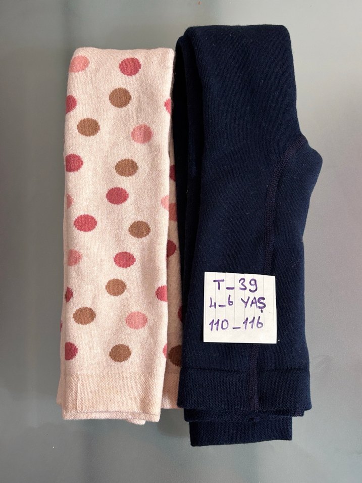 4-6 yaş kız çocukları için lacivert ve pembe puantiyeli, örme yapıda, yumuşak ve sıcak kumaştan yapılmış dar kesim tayt seti. Havlu termal