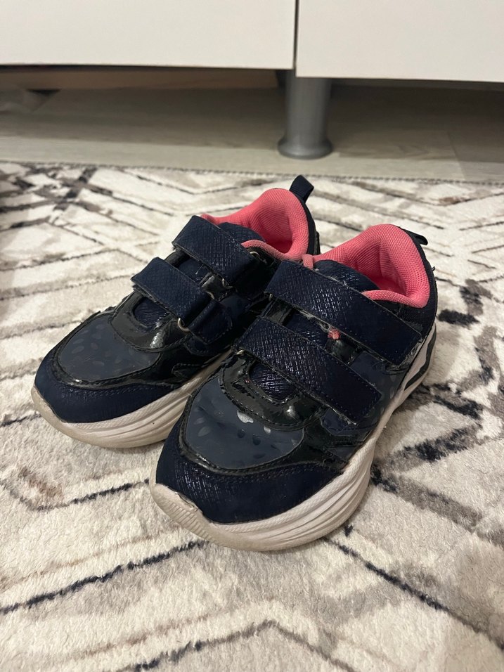 Kız çocukları için lacivert yılan desenli spor ayakkabılar, rahat pembe iç astar ve kolay kullanım için cırt cırt bantlıdır. Kauçuk tabanlıdır. Hiç bir sorunu yoktur
