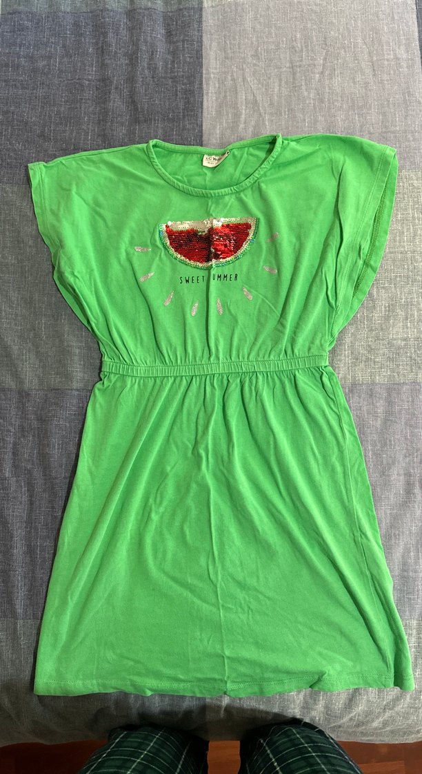 Temiz 10-11 yaşKısa kollu, bisiklet yaka ve bol kesimli kız çocuk elbisesi. Canlı yeşil renkte, sentetik kumaştan ve renkli baskılı, kemerli model.