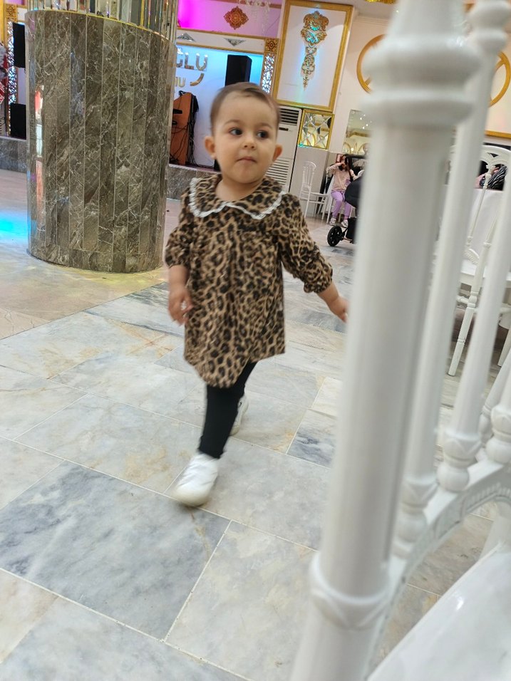 Kız çocuk için leopar desenli, balon kollu ve yakalı, bol kesim elbise. Hafif kahverengi tonlarda, yumuşak sentetik kumaştan yapılmıştır.