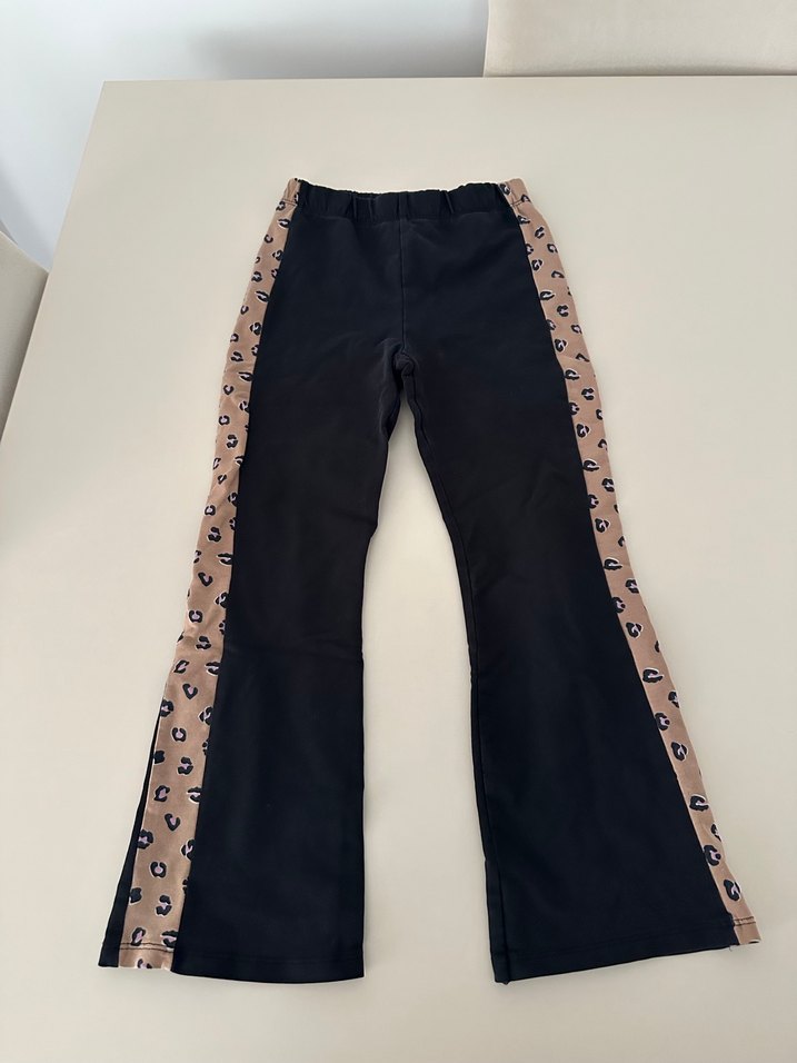 Koyu kahverengi leopar desenli yan şeritlere sahip bol kesim kız çocuk tayt. Resimler son halidir. 8-9 yaş beden.