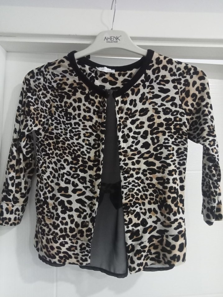 Kız çocukları için uzun kollu, düğmeli ve bol kesim leopar desenli bolero. Yuvarlak yaka ve yumuşak sentetik kumaştan yapılmıştır. Trend sokak stili için uygundur.