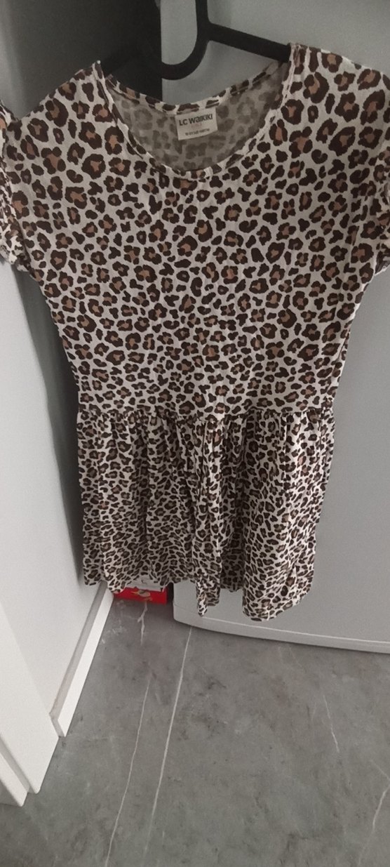 Koyu kahverengi leopar desenli, kısa kollu bol kesim kız çocuk elbisesi. Fırfır detaylarıyla trend rahat stile uygundur. Yepyeni kusuru yok