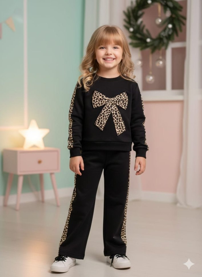 Kız çocukları için regular fit, uzun kollu, bisiklet yaka eşofman takımı. Ön ve yanlarda leopar desenli fiyonk detaylı, yumuşak ve sıcak kumaştan üretilmiştir.