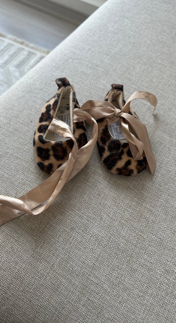 Kahverengi, leopar desenli kız çocuk babetleri, yumuşak sentetik kumaş ve dekoratif fiyonklarla bohem tarzda. Sadece resim için kullanildi çok tatliş bişiiii buuu