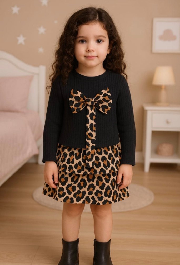 Kız Çocuk Leopar Desenli Fiyonklu etek üst takım