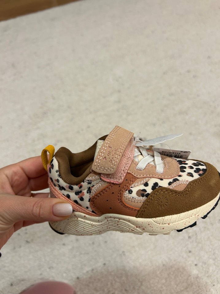 Kahverengi ve pastel leopar desenli, cırt cırtlı bu kız çocuk spor ayakkabısı, kauçuk tabanlıdır ve sokak stiline uygundur.