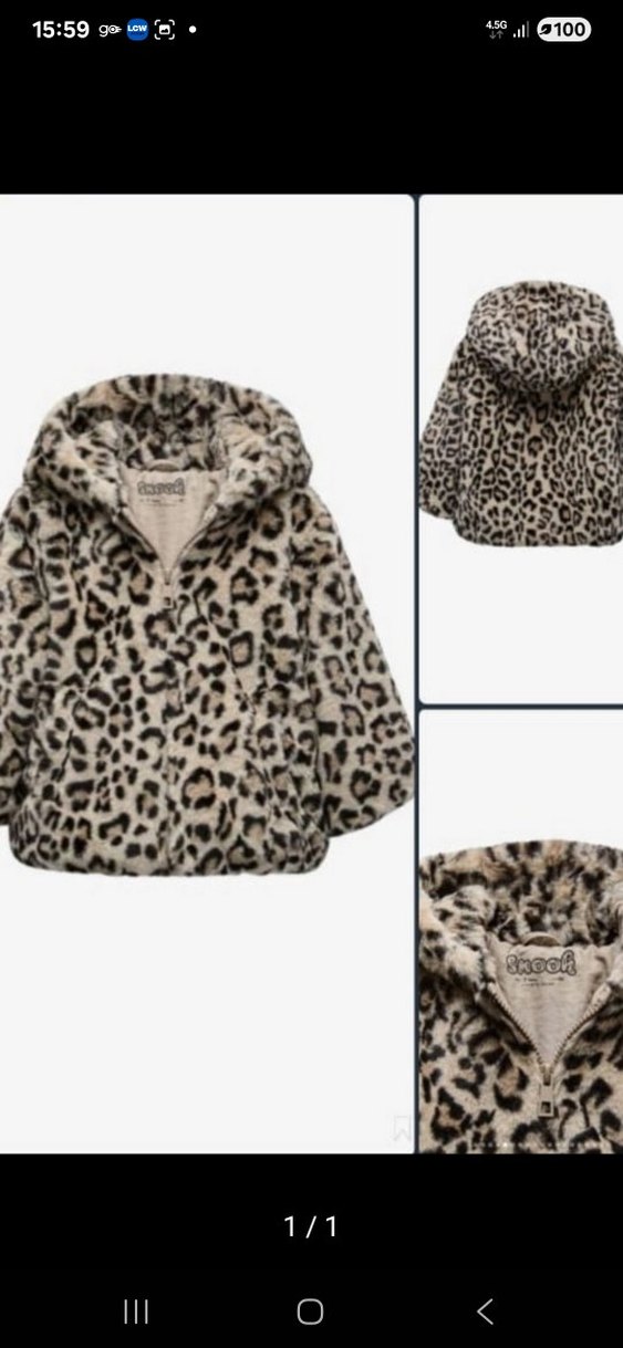 Leopar desenli, kapüşonlu, peluş kumaştan yapılmış bol kesim kız çocuk montu. Kahverengi ve gri tonlarda, trend sokak stili için uygun. 6 yaş için ideal zara style mont
