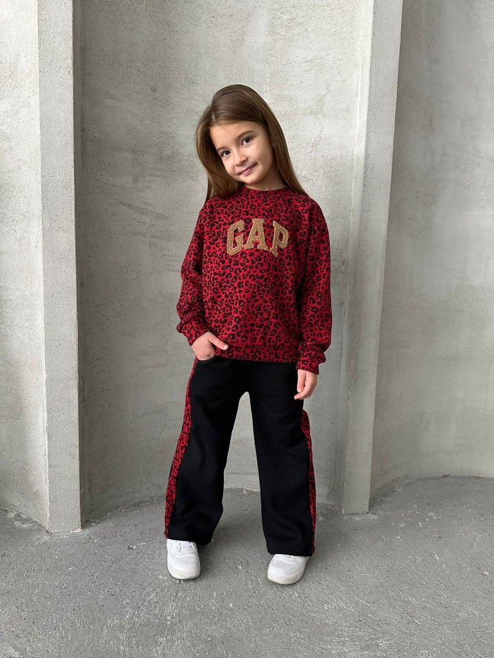 Kız çocukları için kırmızı leopar desenli sweatshirt ve siyah bol kesim eşofman takımı. Yumuşak, sıcak kumaştan, GAP logosu ile rahat ve şık görünüm sunar. 5-6 yaş