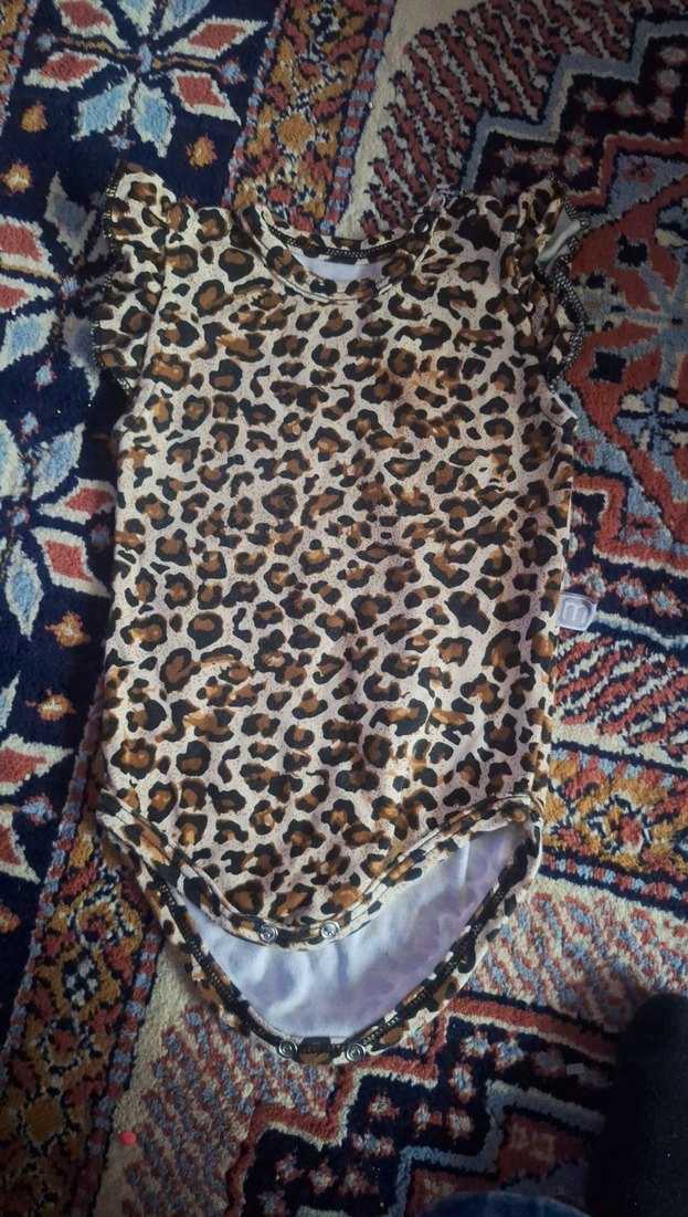 Koyu kahverengi leopar desenli, kısa kollu ve fırfırlı kız çocuk body. Sentetik kumaştan, bisiklet yaka ve sokak stiliyle.