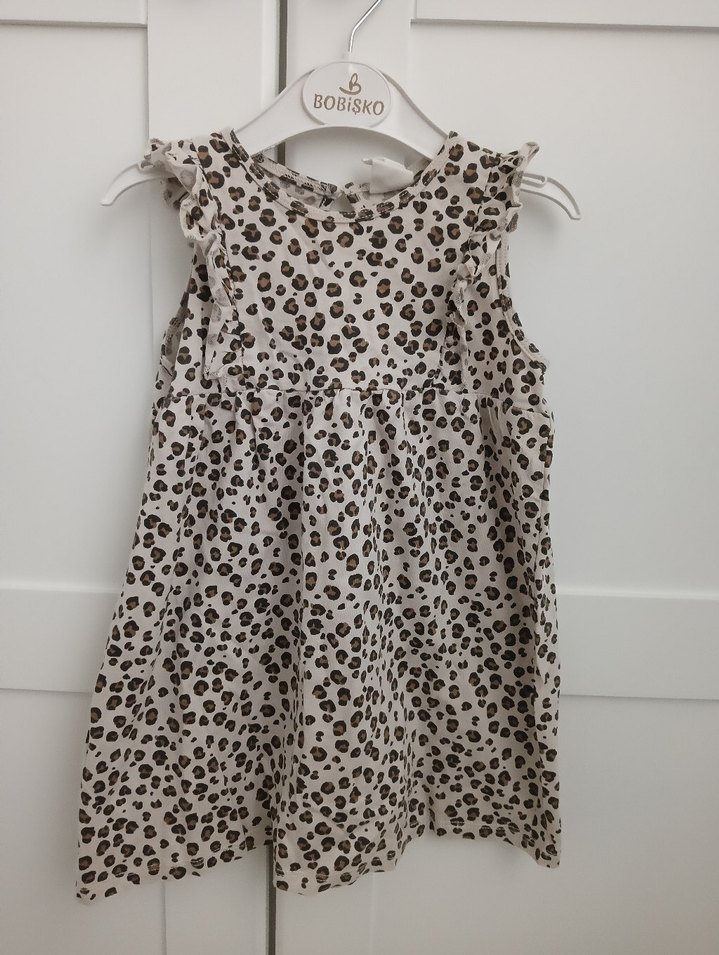Kolsuz, bol kesim kız çocuk elbisesi, leopar desenli ve fırfırlı detaylıdır. Yumuşak sentetik kumaştan ve V yaka tasarıma sahiptir.