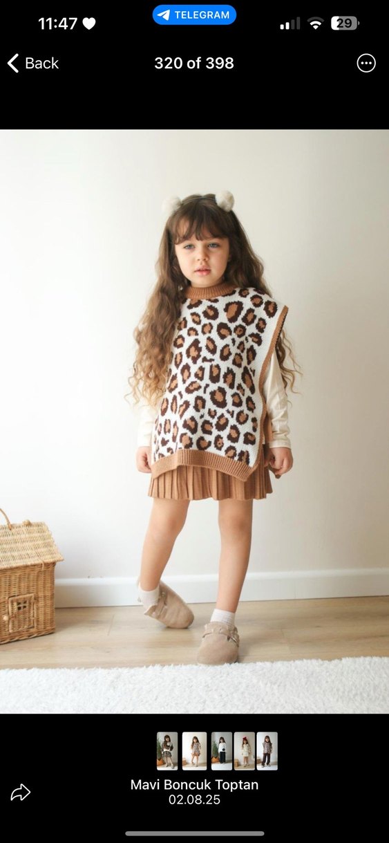 Kız çocukları için leopar desenli, kürklü detaylı, yumuşak örme kumaştan yapılmış bol kesim panço. Uzun kollu ve straplez yakalı, açık kahverengi tonlarında.