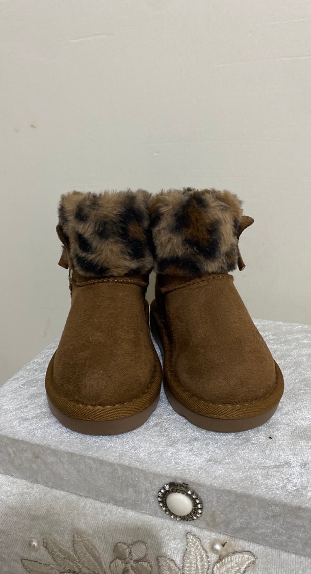 Kız çocuklar için kahverengi süet botlar, leopar desenli kürk detaylarıyla sokak modası tarzını trend günlük rahatlıkla birleştiriyor.