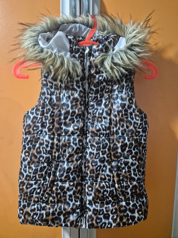 Kız çocukları için kolyeli leopar desenli, kürklü detaylı, sentetik kumaştan yapılmış dar kesim yelek. Sokak tarzı için uygun, kahverengi tonlarında.