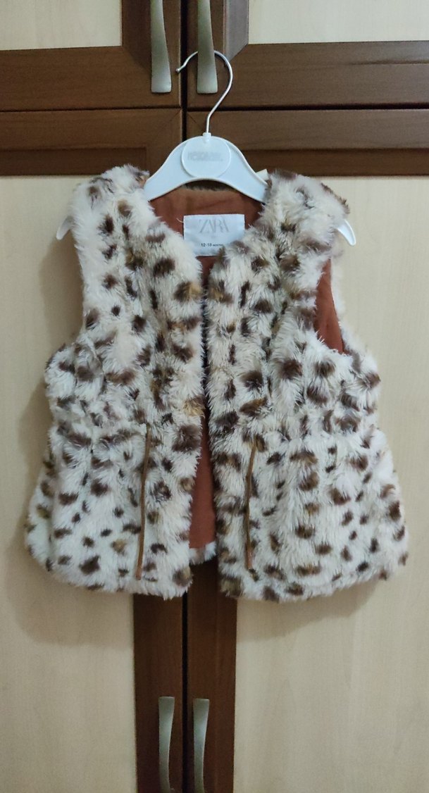 Kız çocukları için tasarlanmış, leopar desenli ve yumuşak kürk detaylı, kolsuz ve straplez yakalı, ince kesim yelek. Sokak modasına uygun.