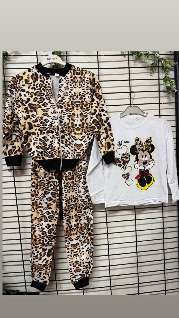 Renkli leopar desenli, kürklü ve bol kesim sweatshirt ile eşofman altı takımı, beyaz Minnie Mouse baskılı uzun kollu tişörtle tamamlanır.