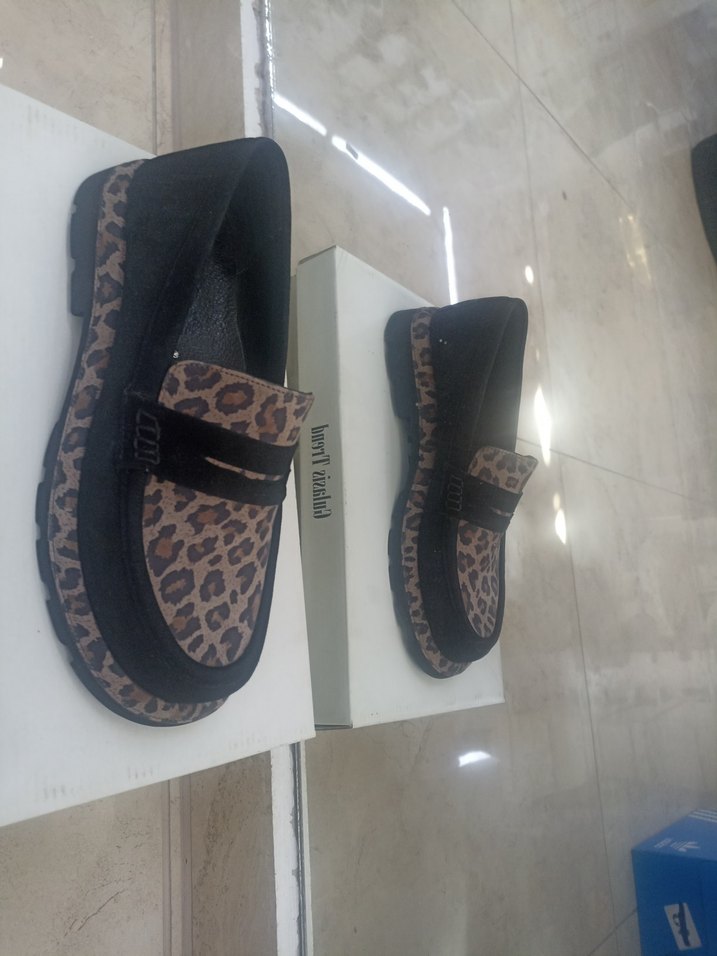 Koyu kahverengi, leopar desenli kız çocuk loafer ayakkabı, tokalı ve kauçuk tabanlı, trend sokak stili için uygun.
