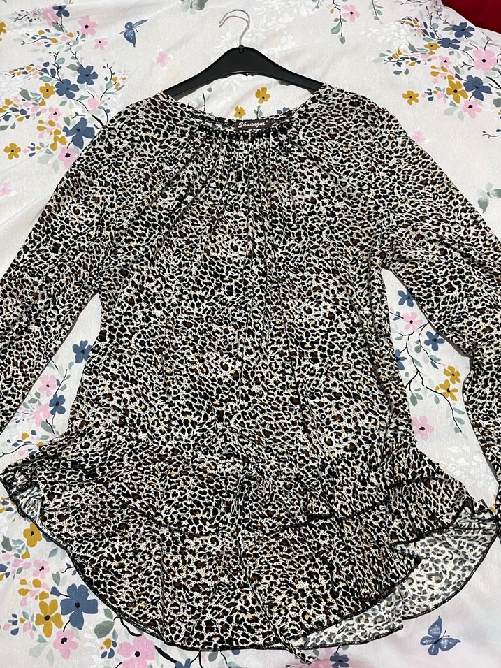 Uzun kollu, yuvarlak yakalı ve leopar desenli bol kesim bluz. Sentetik kumaştan, fırfır detaylı bohem tarzda.