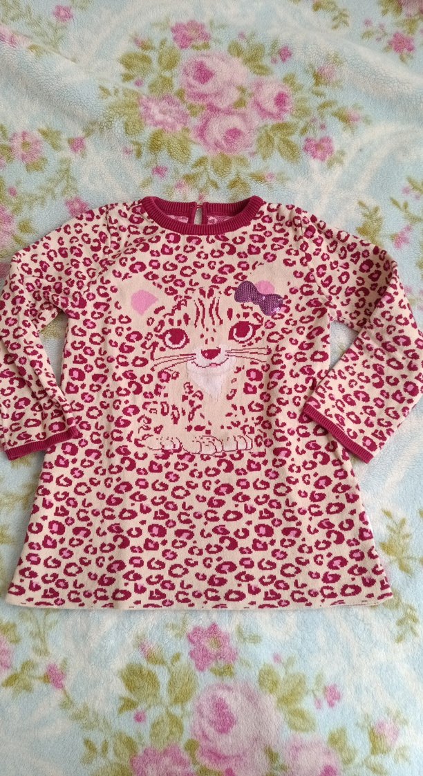 Bu kız çocuk triko elbise, uzun kollu, yuvarlak yakalı ve renkli pembe leopar desenlidir. Yumuşak ve sıcak kumaştan örülmüştür, şık ve rahat bir tarz sunar.