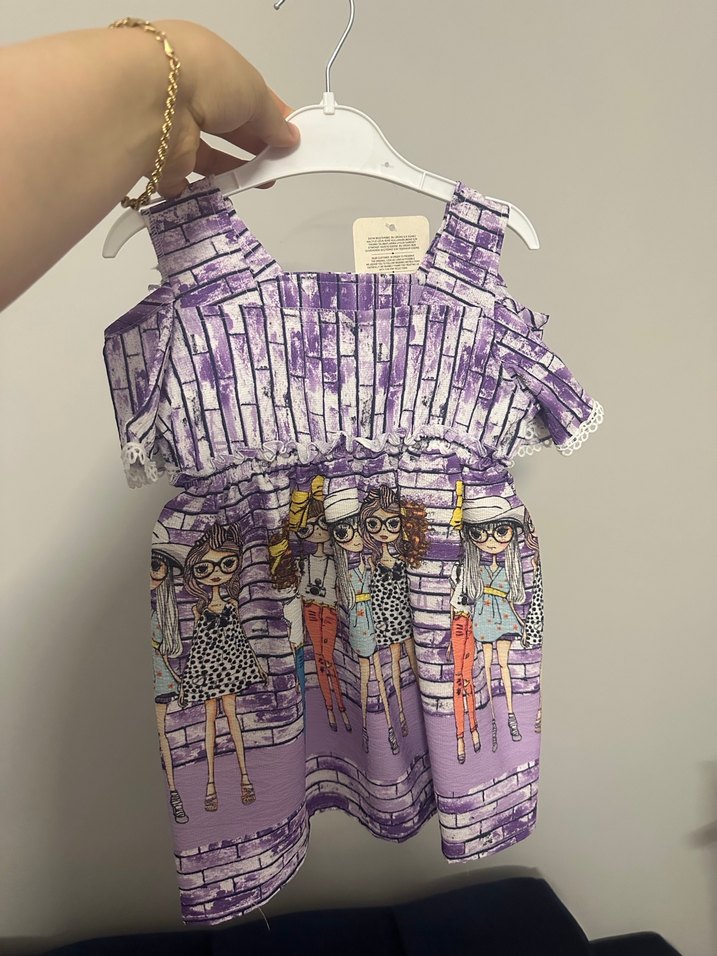 Kız çocukları için bol kesim, kısa kollu ve yuvarlak yakalı, yumuşak dokulu baskılı kumaştan ve dantel detaylı lila renkte elbise. Bohem ve retro tarzını yansıtır.