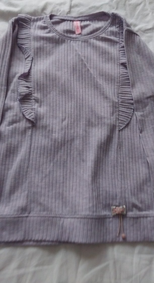 Kız çocukları için pilili detaylara sahip, uzun kollu ve yuvarlak yaka lila bluz. Rahat ve bol kesimdir.
